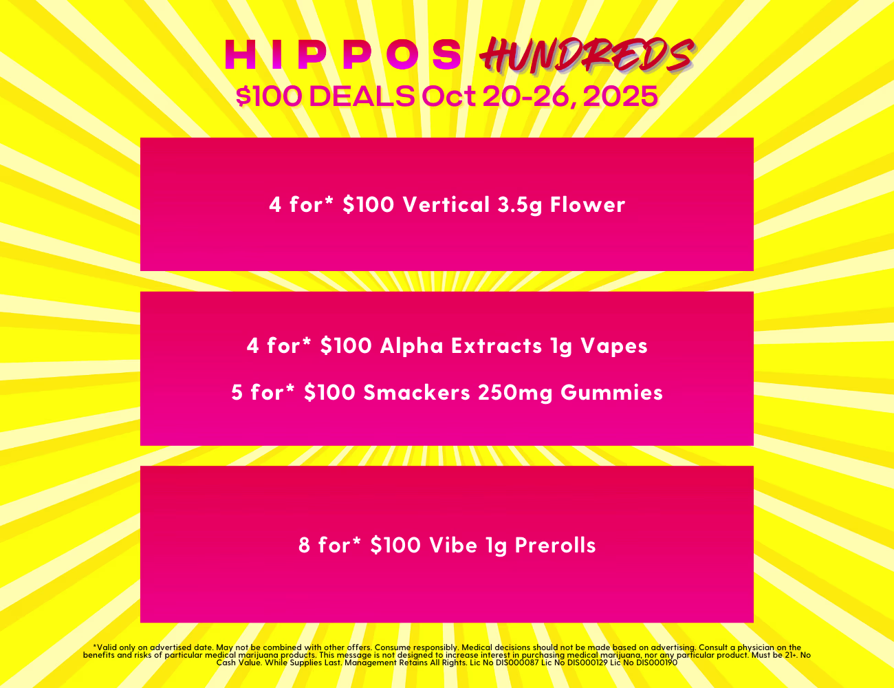 For the week of October 20–26, 2025, we’ve shuffled the deck to feature a fresh set of fan-favorite brands. We're talking next-level vapes, delicious edibles, classic flower, and a preroll deal so good you'll think it's a typo. Get your wallet ready, because this round of Hippos Hundreds is all about variety, volume, and sheer, unadulterated value.